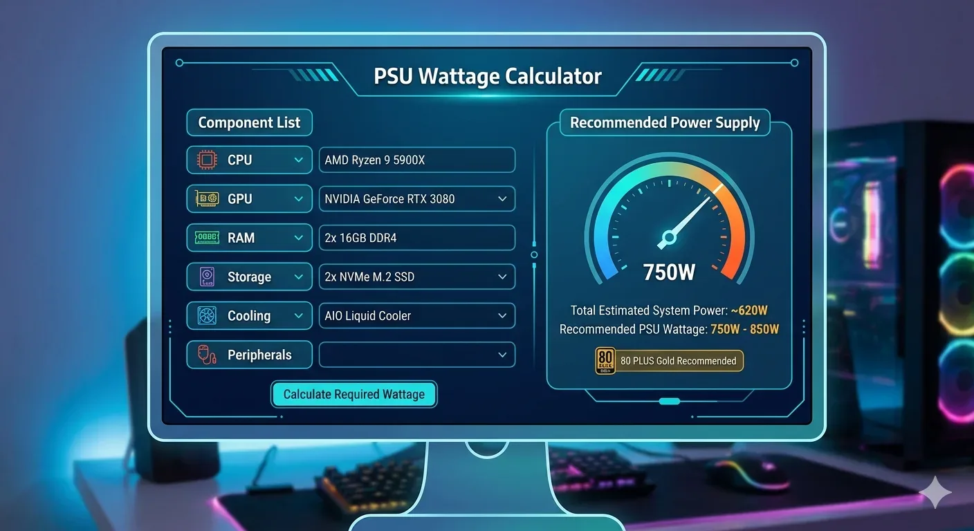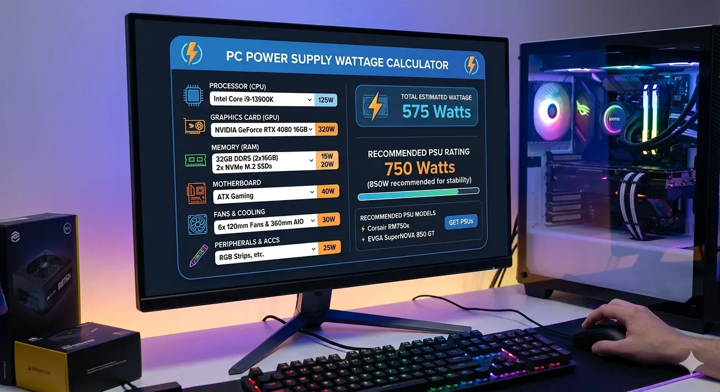 A PSU wattage calculator helps you determine the total power consumption of all components in your PC and recommends the minimum wattage your power supply should be rated for. It prevents you from buying a PSU that is too weak for your system or unnecessarily overspending on one that is far more powerful than you need.